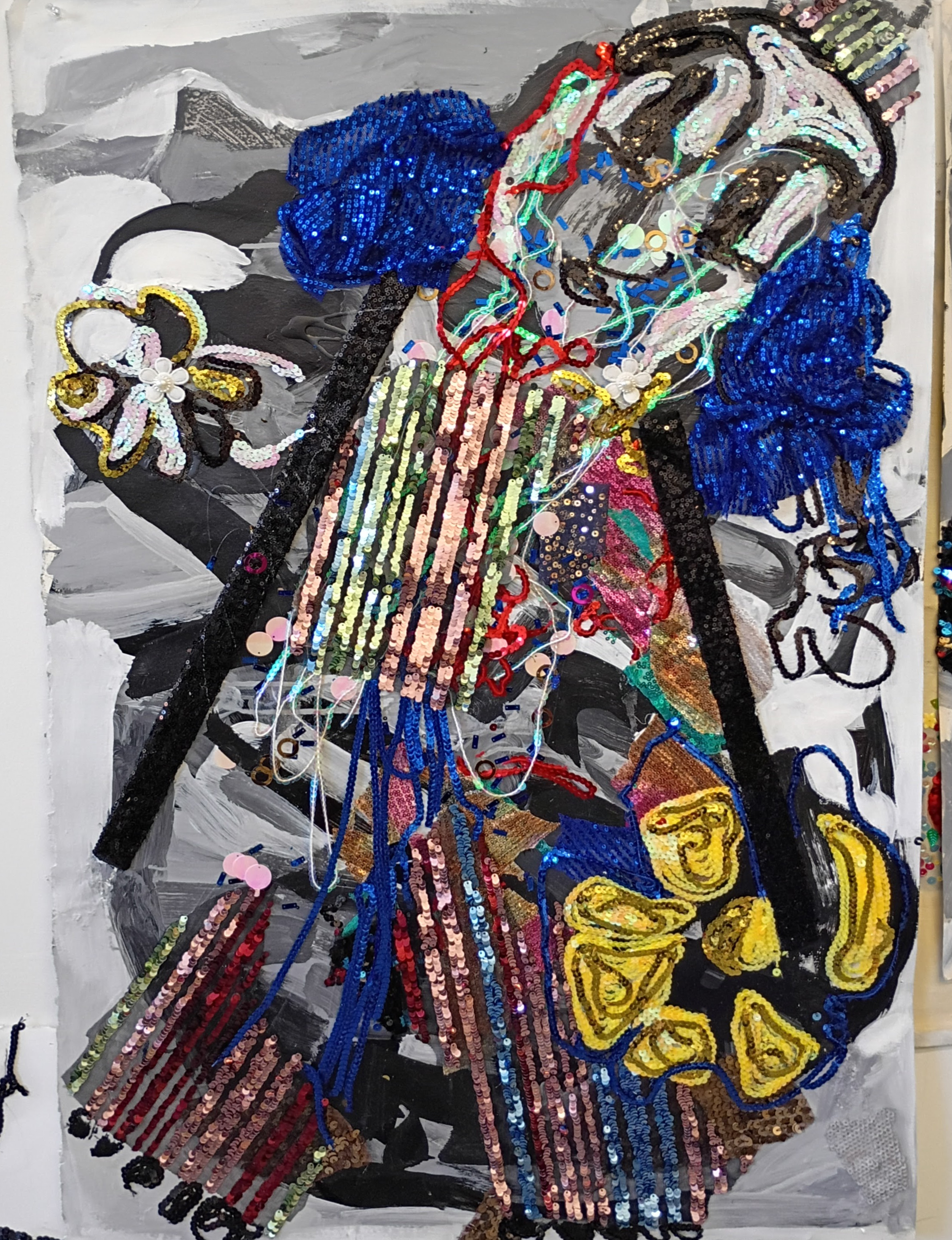 Haute Couture24 x 30” 2025 Sequins on painted paperI am having way too much fun in this one. Request Purchase Information